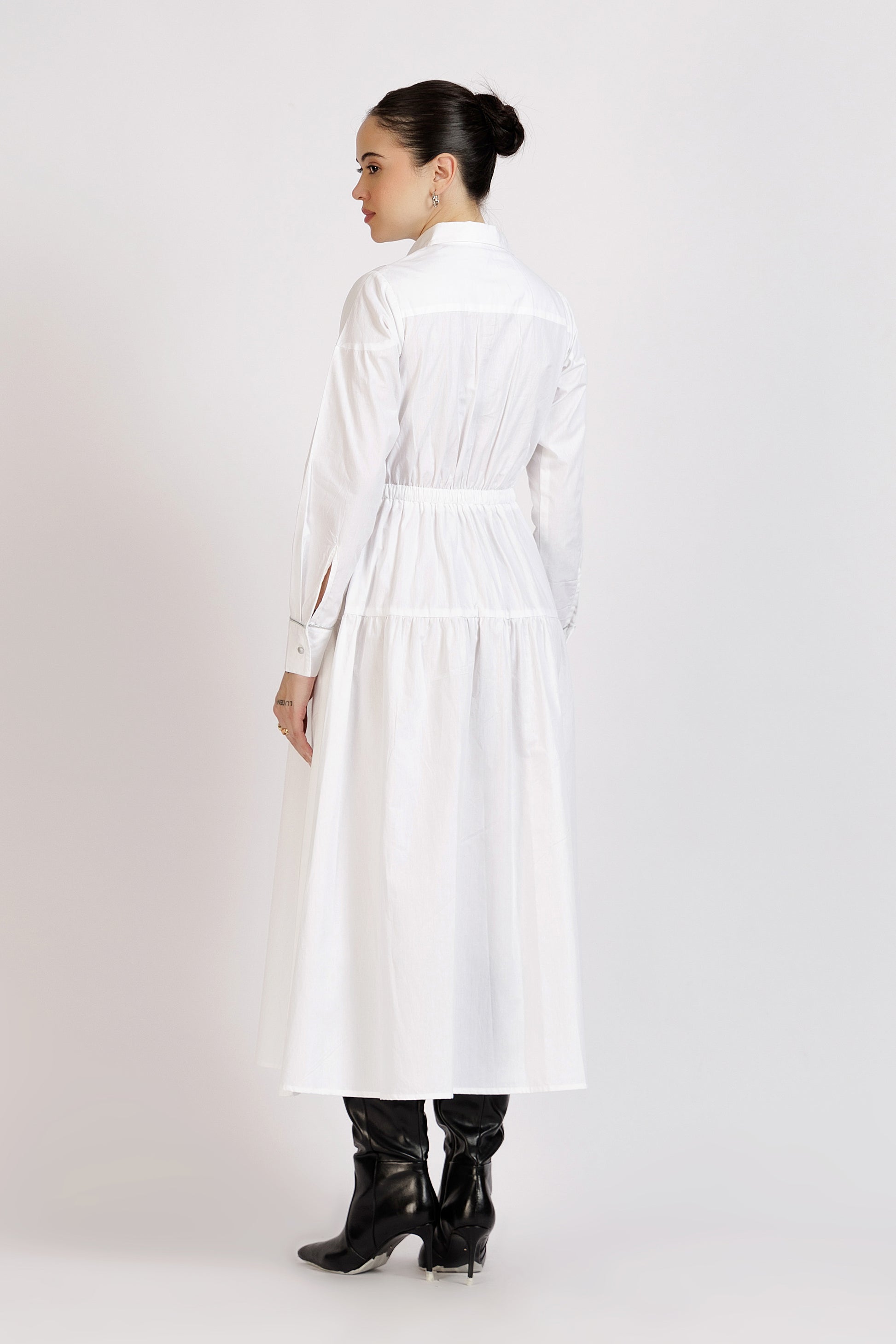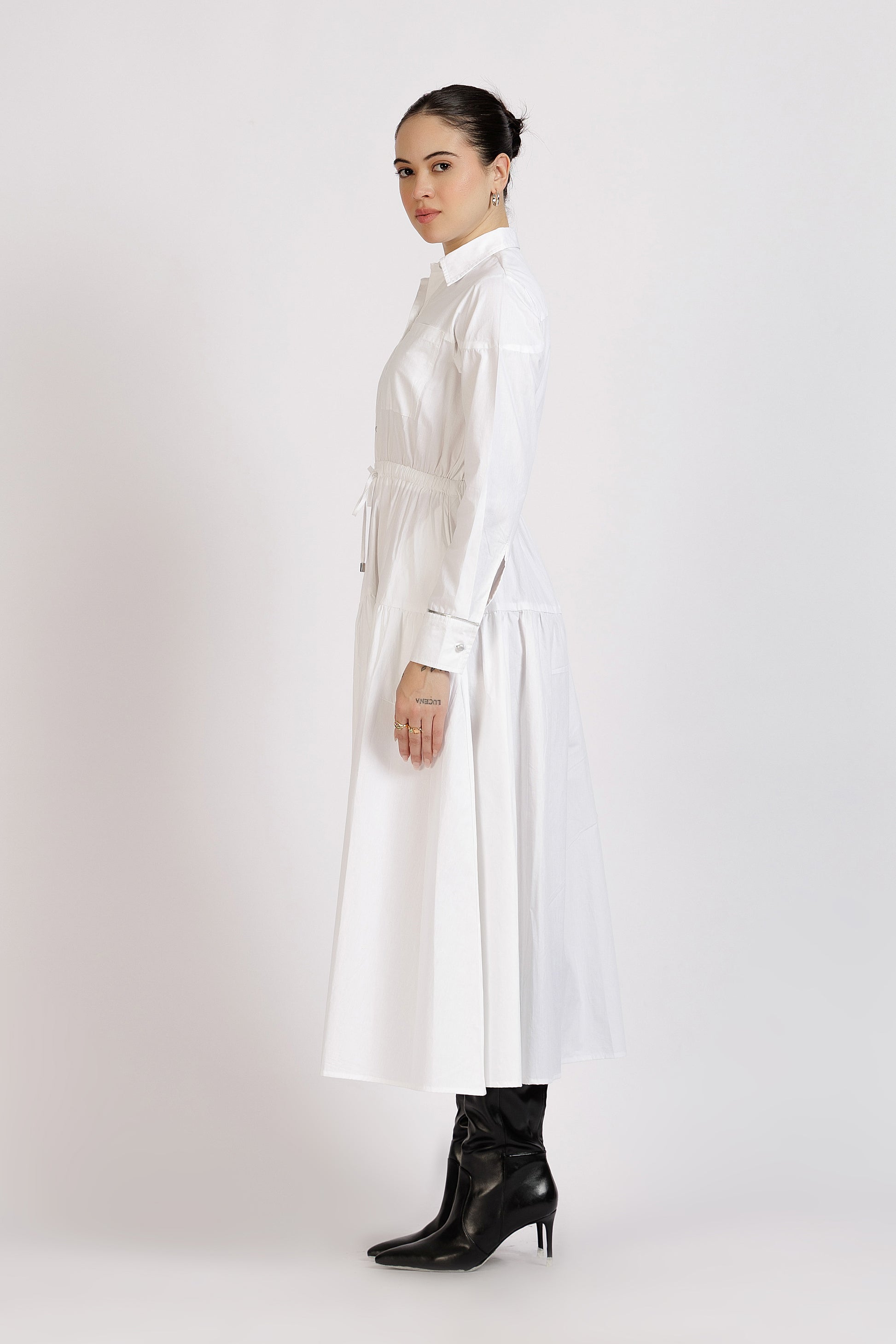 - Metallic bindings on placket and cuffs adding a refined, textural detail