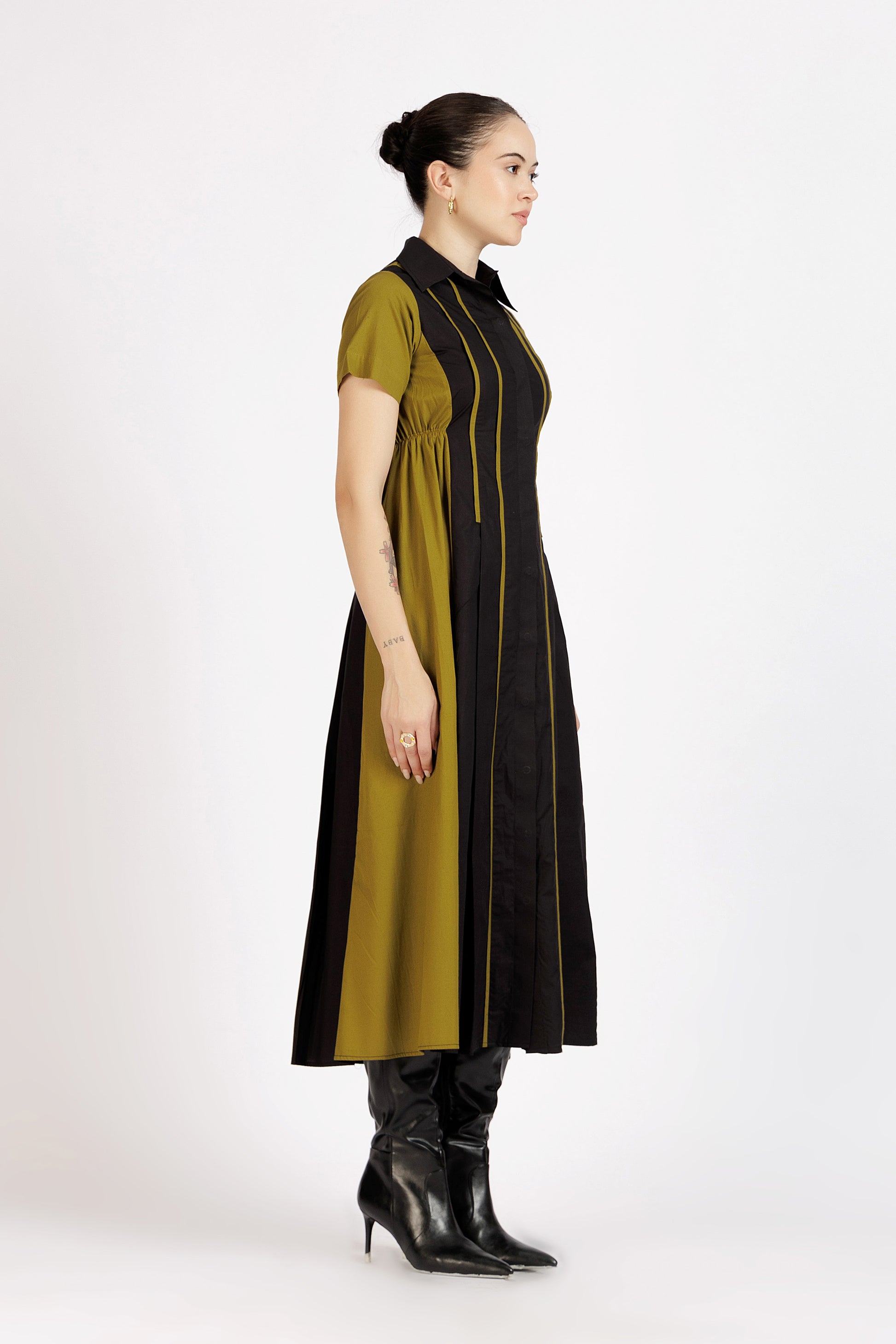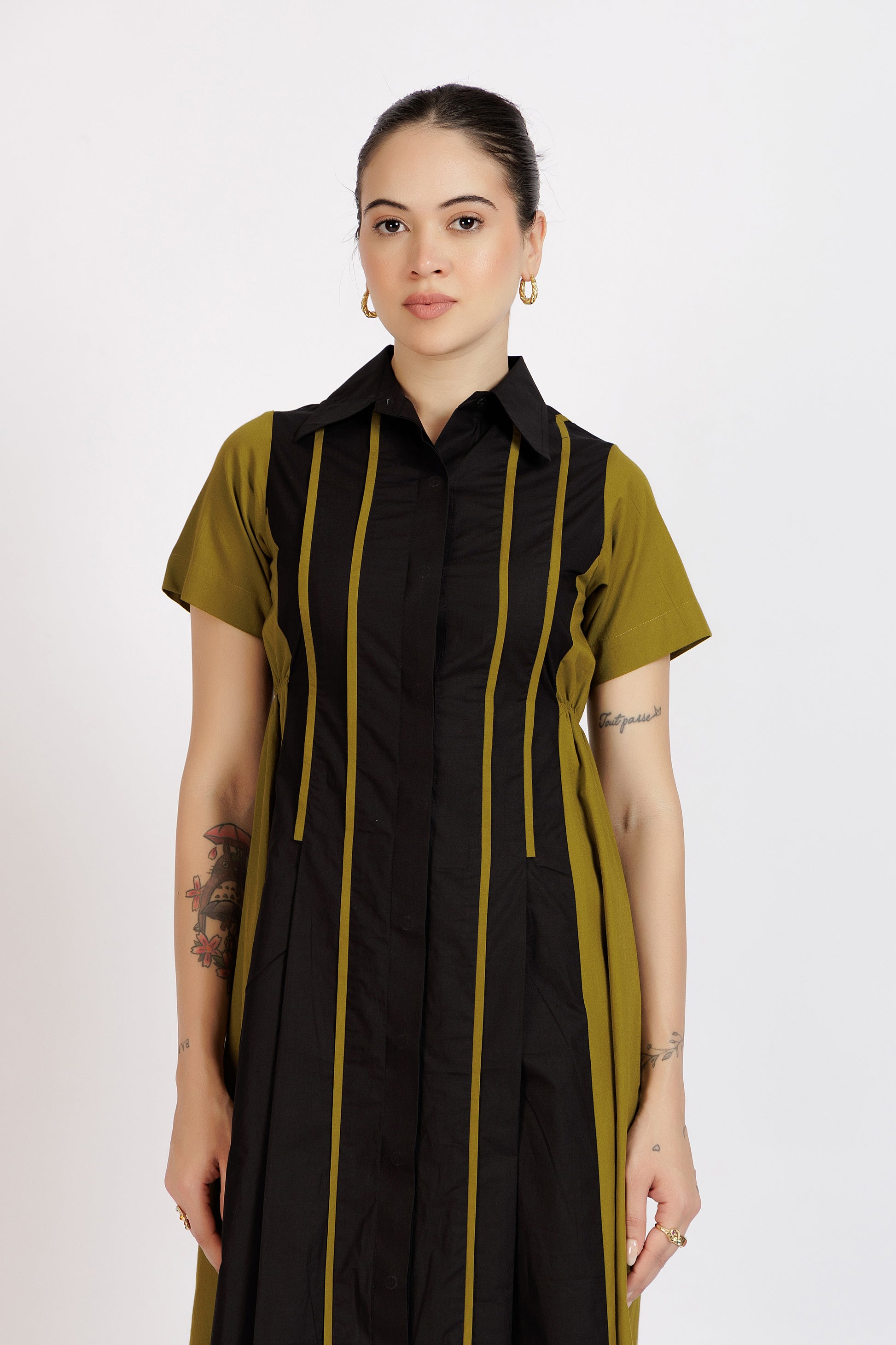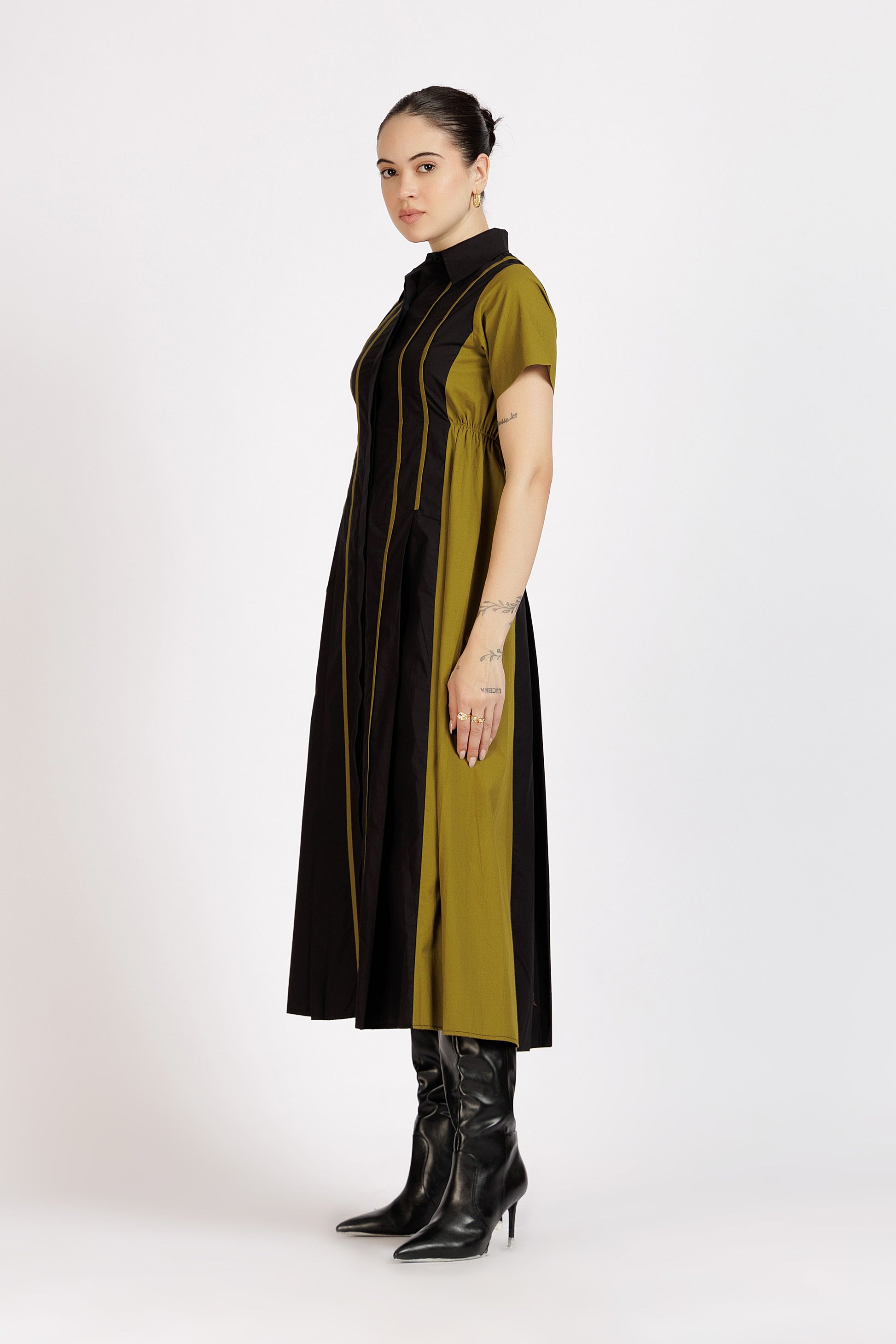 - Shirt dress silhouette with contrast bindings for defined detailing