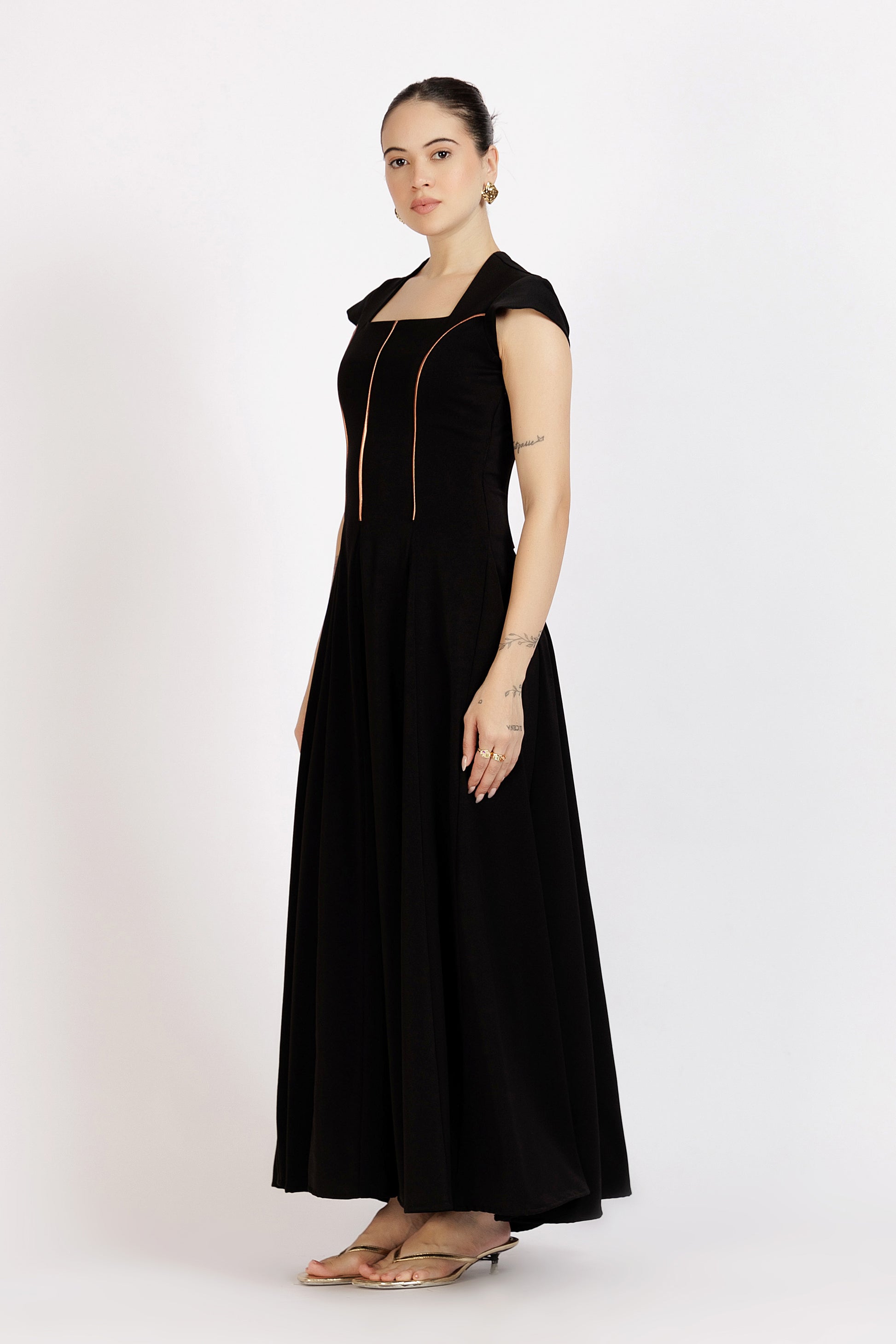 - Square neckline with cap sleeves for a clean, structured silhouette